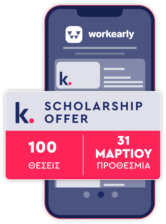 Τα scholarships by kariera x Workearly είναι ένα πρόγραμμα υποτροφιών που προσφέρεται σε επιλεγμένους χρήστες του kariera.gr, παρέχοντας πολύ υψηλή επιδότηση διδάκτρων για τα κορυφαία προγράμματα του Workearly. Στόχος του προγράμματος είναι να ενισχύσει την απασχολησιμότητα των επαγγελματιών, δίνοντάς τους τη δυνατότητα να αποκτήσουν σύγχρονες και πρακτικές δεξιότητες που ανταποκρίνονται στις ανάγκες της αγοράς εργασίας.Μέσα από τα προγράμματα του Workearly, οι συμμετέχοντες αποκτούν τα κατάλληλα skills ώστε να συνδεθούν πιο αποτελεσματικά με νέες θέσεις εργασίας και επαγγελματικές ευκαιρίες.